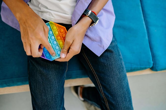 A person sat down holding a rainbow-coloured pop-it fidget toy.
